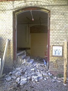 05.11.2018 Der Abbruch der Bodenplatte und des alten Sockels unter der Treppe im vorderen Bereich des Pferdestalls. Der Übergang zum restlichen Teil des Bildhauerateliers von Christiane Erdmann ist provisorisch abgedichtet. |