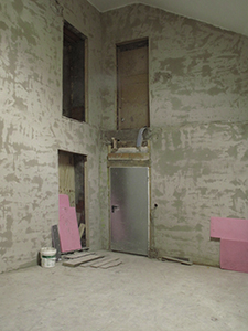 Im Treppenhaus selbst wird derweil eine erste Putzschicht aufgetragen, bevor die Geschossdecke später entfernt wird. Noch führen die Türen aus Malzhaus (links) und Südflügel (rechts) teilweise ins "Nichts". | ||